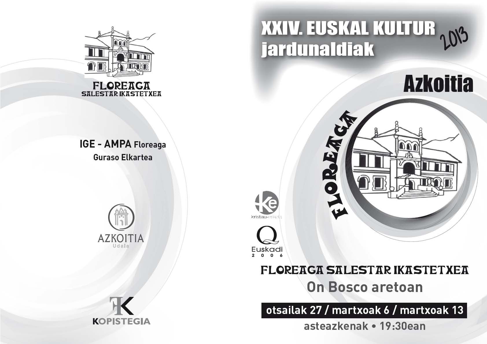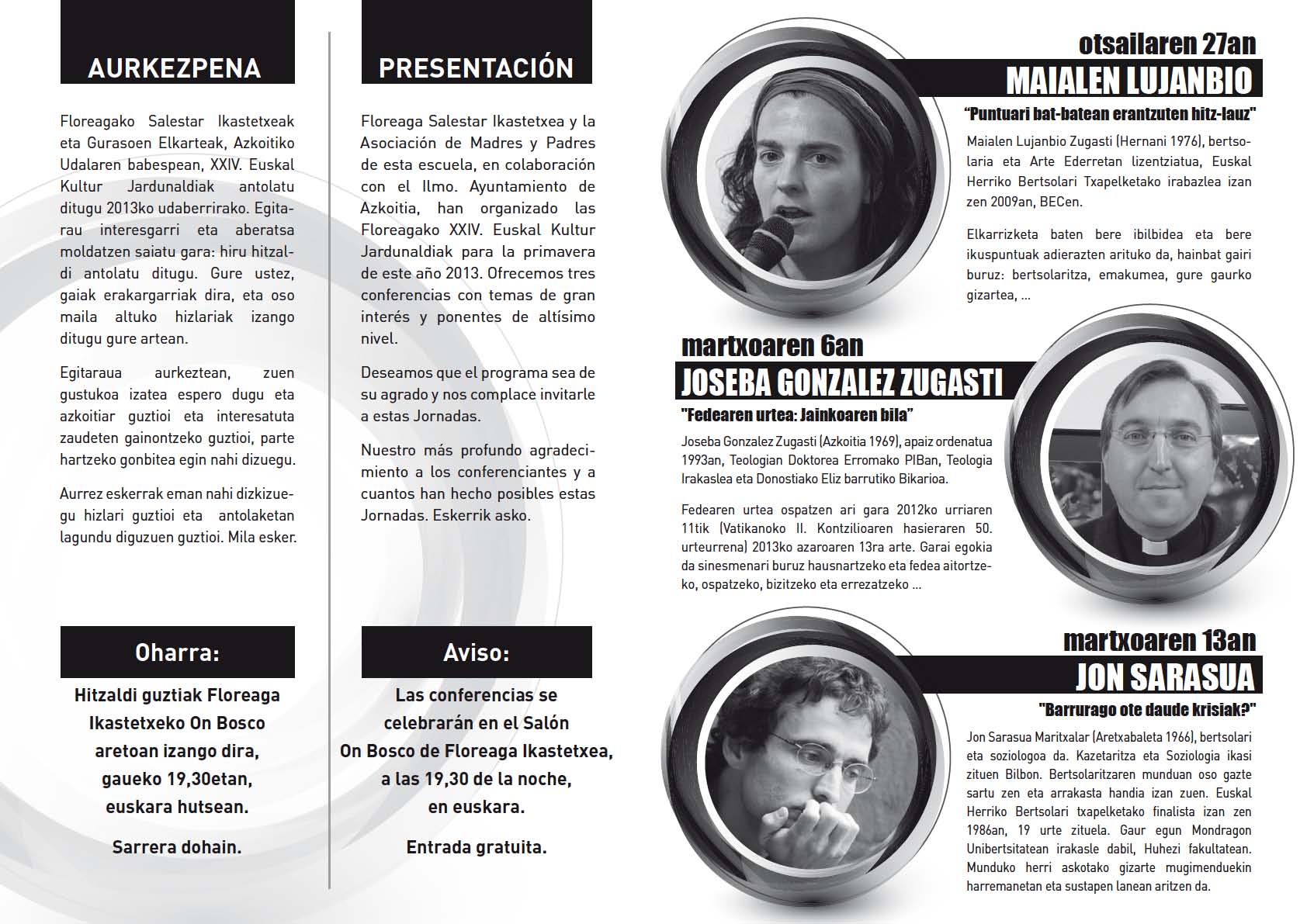 Floreagako Salestar Ikastetxeak eta Gurasoen Elkarteak, Azkoitiko Udalaren babespean, XXIV. Euskal Kultur Jardunaldiak antolatu ditugu 2013ko udaberrirako. Egitarau interesgarri eta aberatsa moldatzen saiatu gara: hiru hitzaldi antolatu ditugu. Gure ustez, gaiak erakargarriak dira, eta oso maila altuko hizlariak izango ditugu gure artean.
